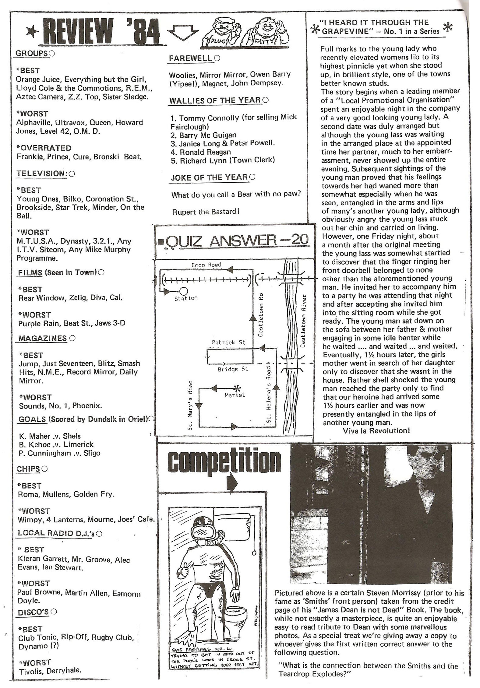 1. Review list of 1984 – Forget George Orwell, this was the year Woolworths & the Magnet cinema closed in Dundalk! This page also features a cartoon by Oriel Park MC Mickey Duffy.