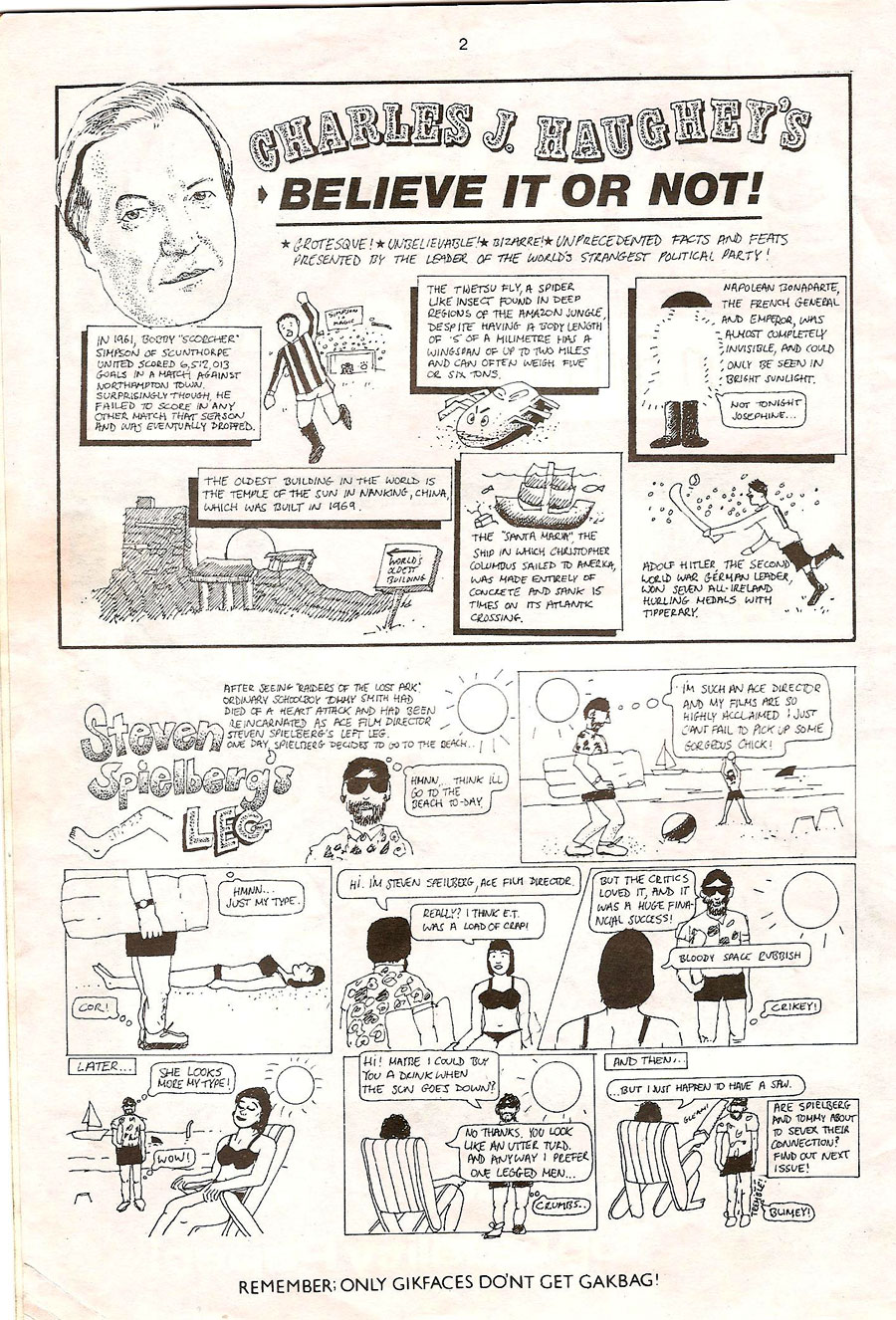 I mentioned Gakbag Comic briefly in an earlier post about Drogheda mag Almost News. This Viz like comic features a lot of strips from its editor, Arthur Mathews and its assistant editor Mick Nugent I don’t know how many issues were published . I only have this Issue & I guess that it is from 1988.