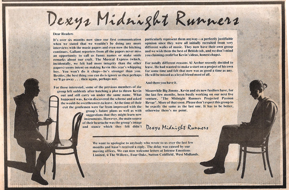 Kevin Rowland of Dexys Midnight Runners, having had a few run ins with the music press, imposed a press embargo in July 1980 and would instead use their own ads in the music papers to explain the band’s position. The scan above is one of these ads. Its at a time between”Searching for the Young Soul Rebels” and “Too-Rye-Ay” when Rowland kicked out some members from the band as they had “hatched a plot to throw Kevin out and still carry on under the same name”