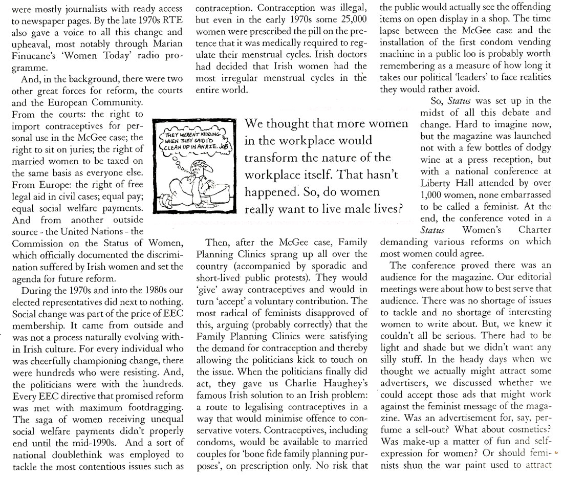 After I put a search in google for ‘women issues irish magazine’ or something to that effect, your blog came up. I can’t thank you enough because I’m now using Status as a topic for my history essay in my journalism masters class.