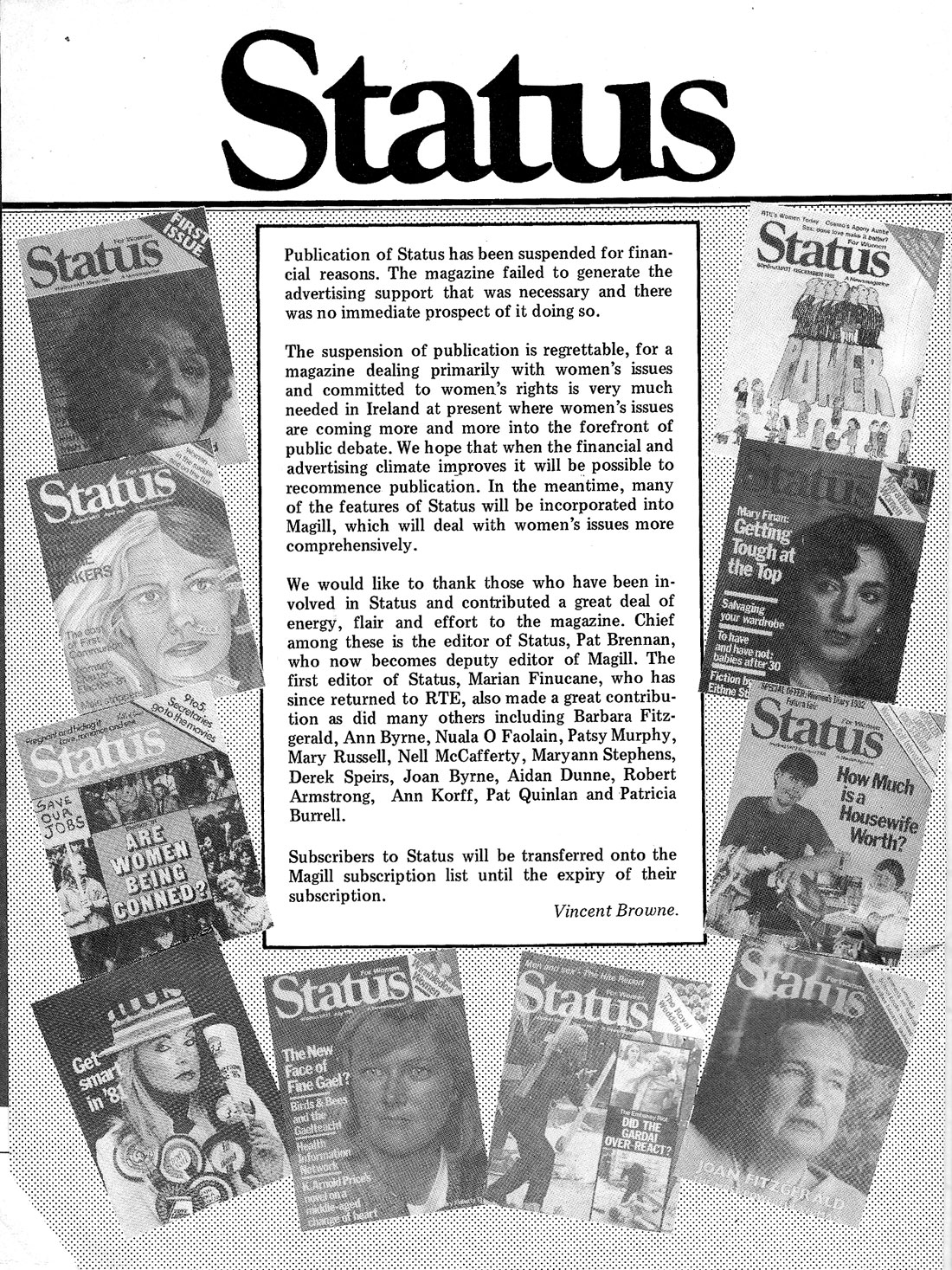 Above scan is an advert which appeared in Magill, January 1981 ahead of the launch of the first issue of its sister magazine, “Status” on 19 February, 1981. Twelve months & 10 issues later, Magill published a one page notice (see scan below) stating that publishing of future Status issues had been suspended.