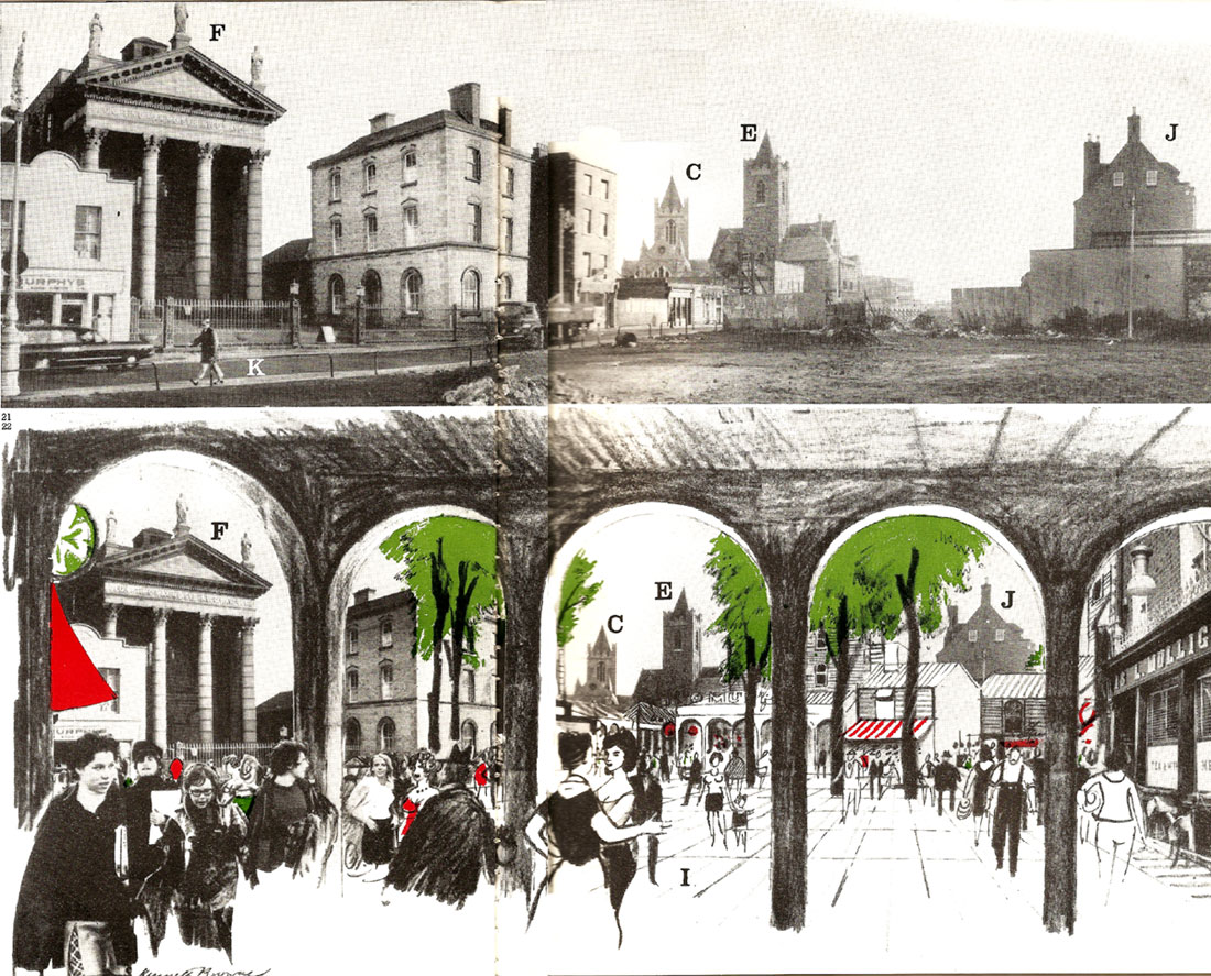 The above is from 1974, published in a book called “A Future for Dublin”. The book has some interesting photos and artists impressions of proposals to transform empty spaces in the city. I start with this one as I liked the way they’ve moved L Mulligans Grocer from Stoneybatter up to Christchurch. (see far right of on sketch/montage above)
