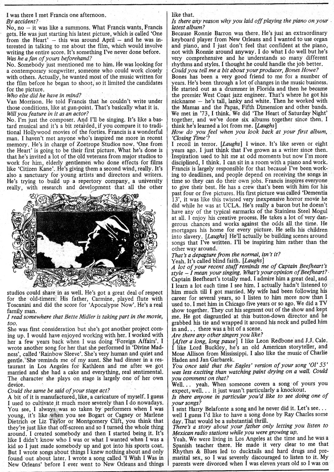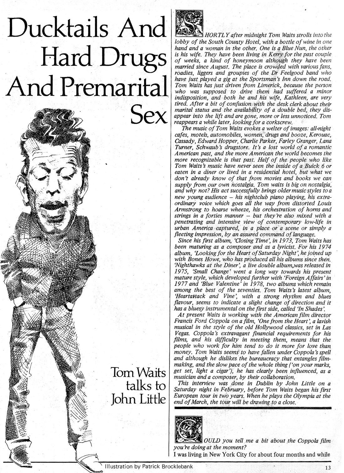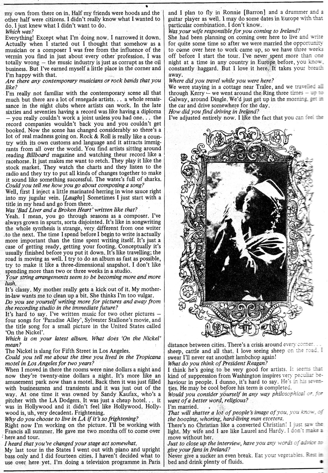 Tom Waits spent a few weeks living in Ireland (mainly Kerry) with his wife before setting off on his European tour in early 1981. This interview with John Little took place in February,1981, over a bottle of Blue Nun at the South County Hotel, Dublin. (hence advert at bottom of page). Waits would return to Ireland to perform in Cork, Galway and for 3 nights at the Olympia Theatre, Dublin at the end of March.