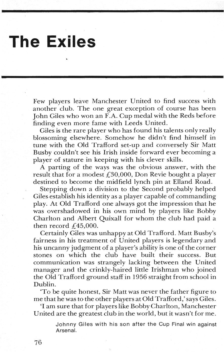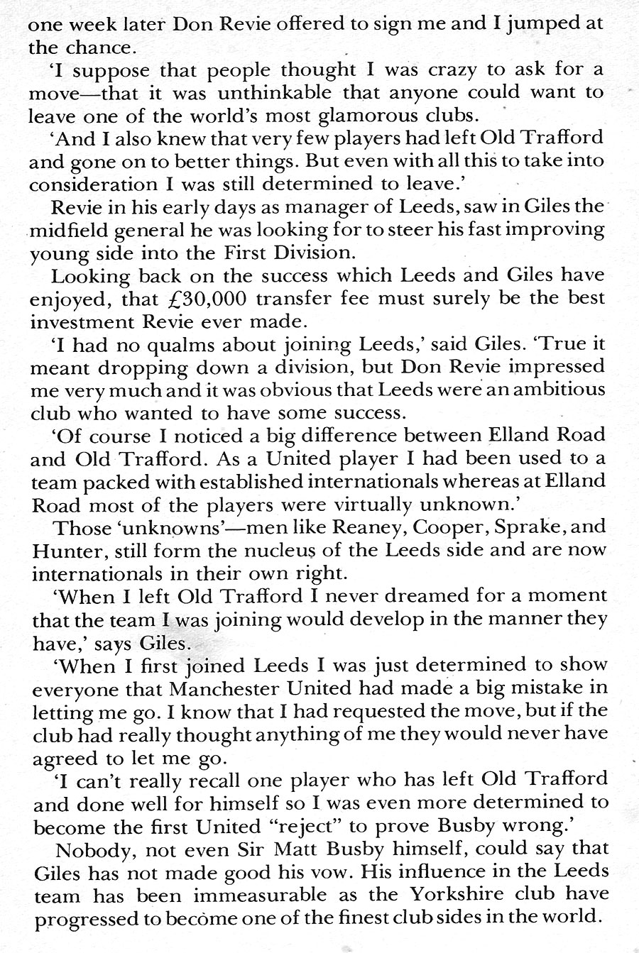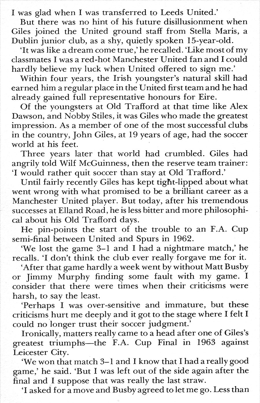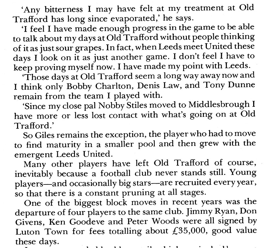 And below, from that 1972 Manchester Utd Football Book No. 7 (edited by David Meek, isbn 0091126401), I’ve scanned this photo and its related interesting short article on Giles departure from Man Utd to Leeds.