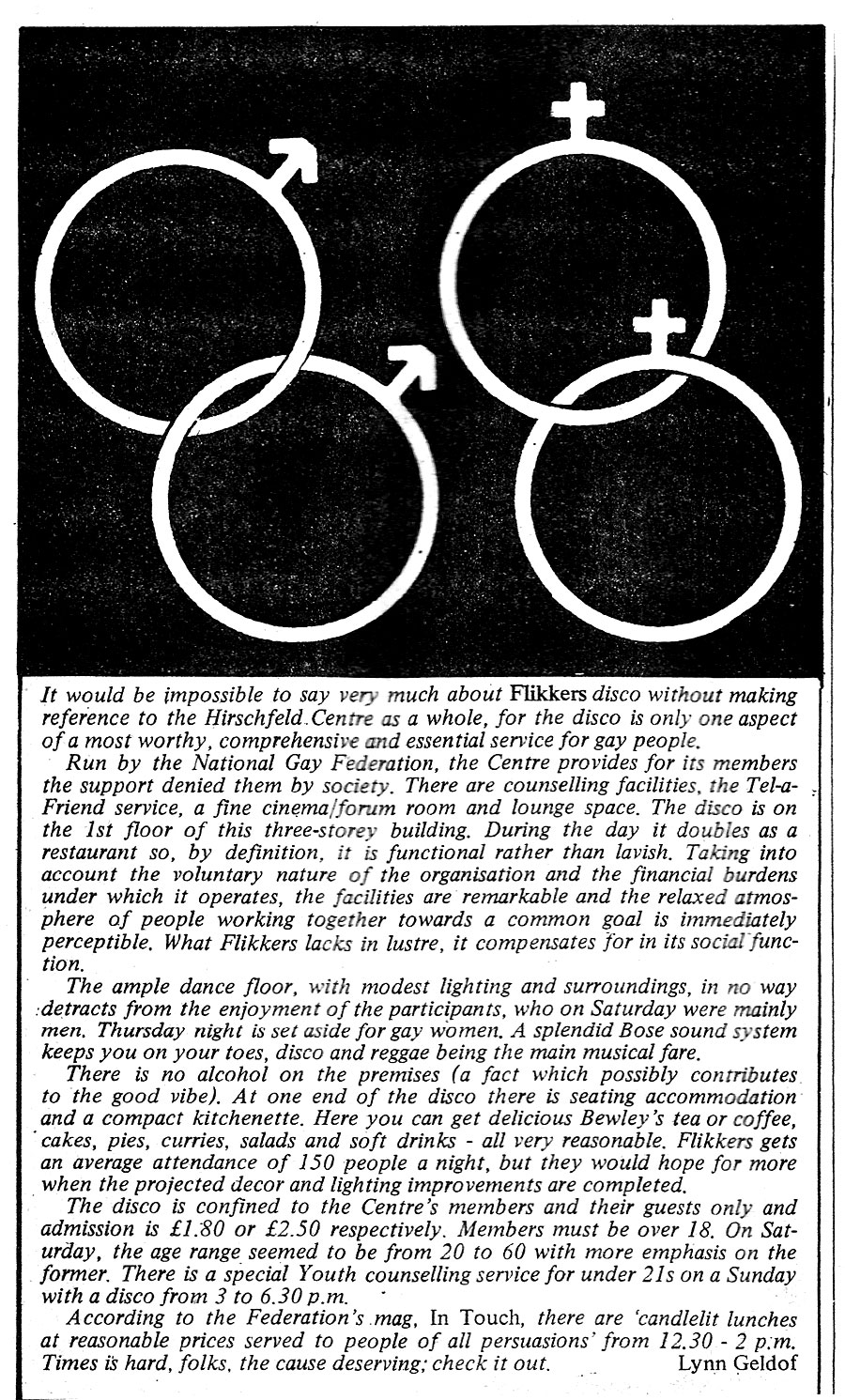 The Hirshfield was a fantastic club. A wonderful atmosphere and an inspiration for me in setting up the Dance Factory in Drogheda where girls danced with boys and boys danced with boys and no-one really cared at all which is how i think it should be. I believe the Hirshfield was fire-bombed in the early 80’s. Did a quick google but not much info about it. Tonie Walsh was mentioned as a prime mover and someone who has documented gay history in Ireland.