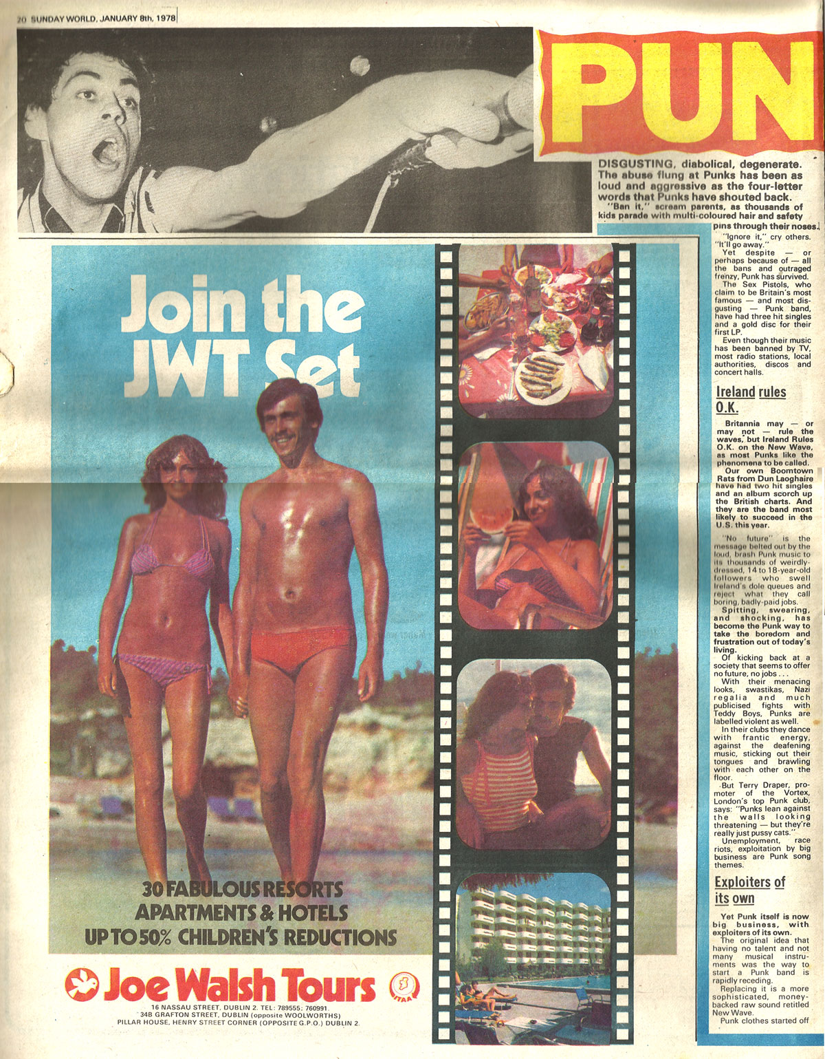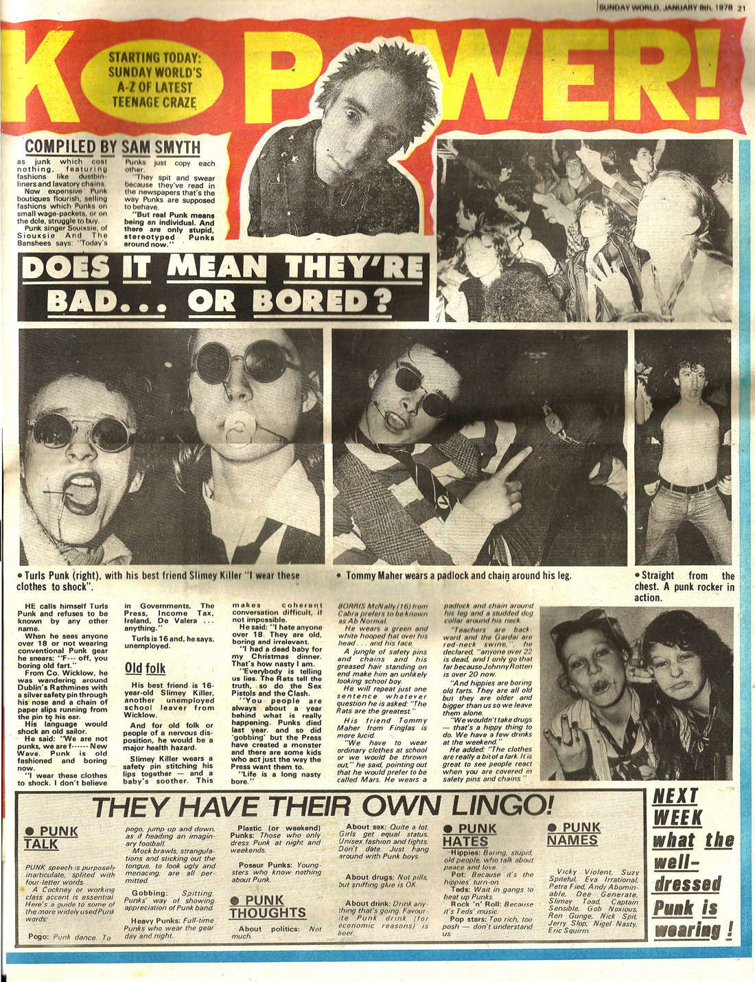 used to have that Sunday World piece sellotaped to the bedroom wall.remember a couple of us in summer of 1976…the scorcher,being in Galway and the faces of locals who thought they’d seen some chjarcters from star trek or planet of the apes.The only folks who talked to me and my brother were two English girls who had some idea what we were about.Hibernia magazine had bits on punks and indeed skinheads in the early seventies if anyone cares to root around old archived copies.Also the limerick leaders had great articles on limerick’s skinhead problem and Limerick F.C’s attempts to deal with them.Also the Dundalk Argus and Sligo paper as there was big problems with skinheads there.
