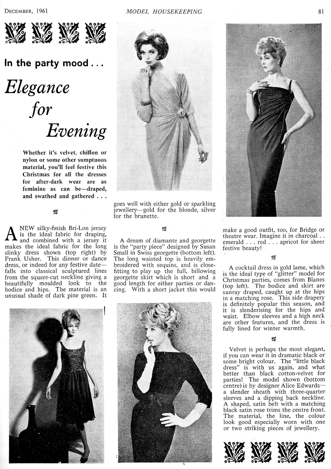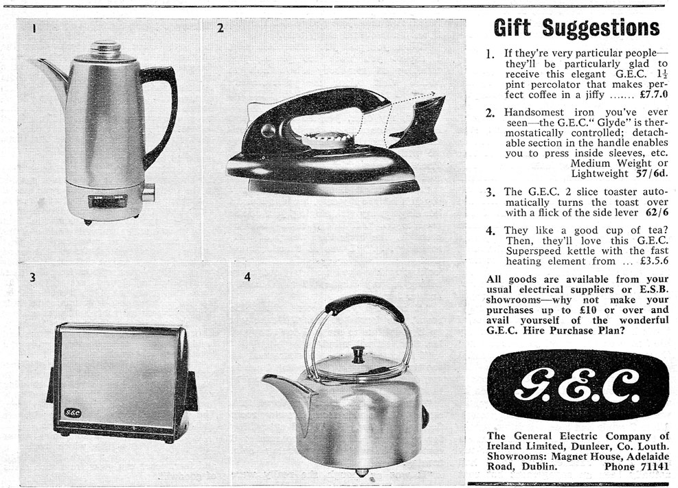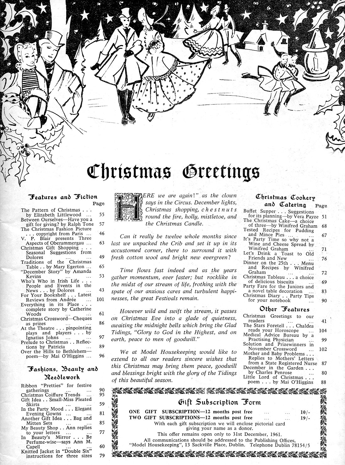 Printed and published by Grafton Publications, NCR, Dublin 7, Model Housekeeping was a monthly A4 glossy magazine which, I believe, ran until 1969. This is from 1961 and, with it being the December issue, it is full of festive adverts and tips. For some reason the page numbering starts at 40! It has over 60 pages. Check out the Contents Page thumb below to get an idea of the range of content, much of which was complimentary reviews for goods advertised elsewhere in the magazine – see Shopping Tips scan below.