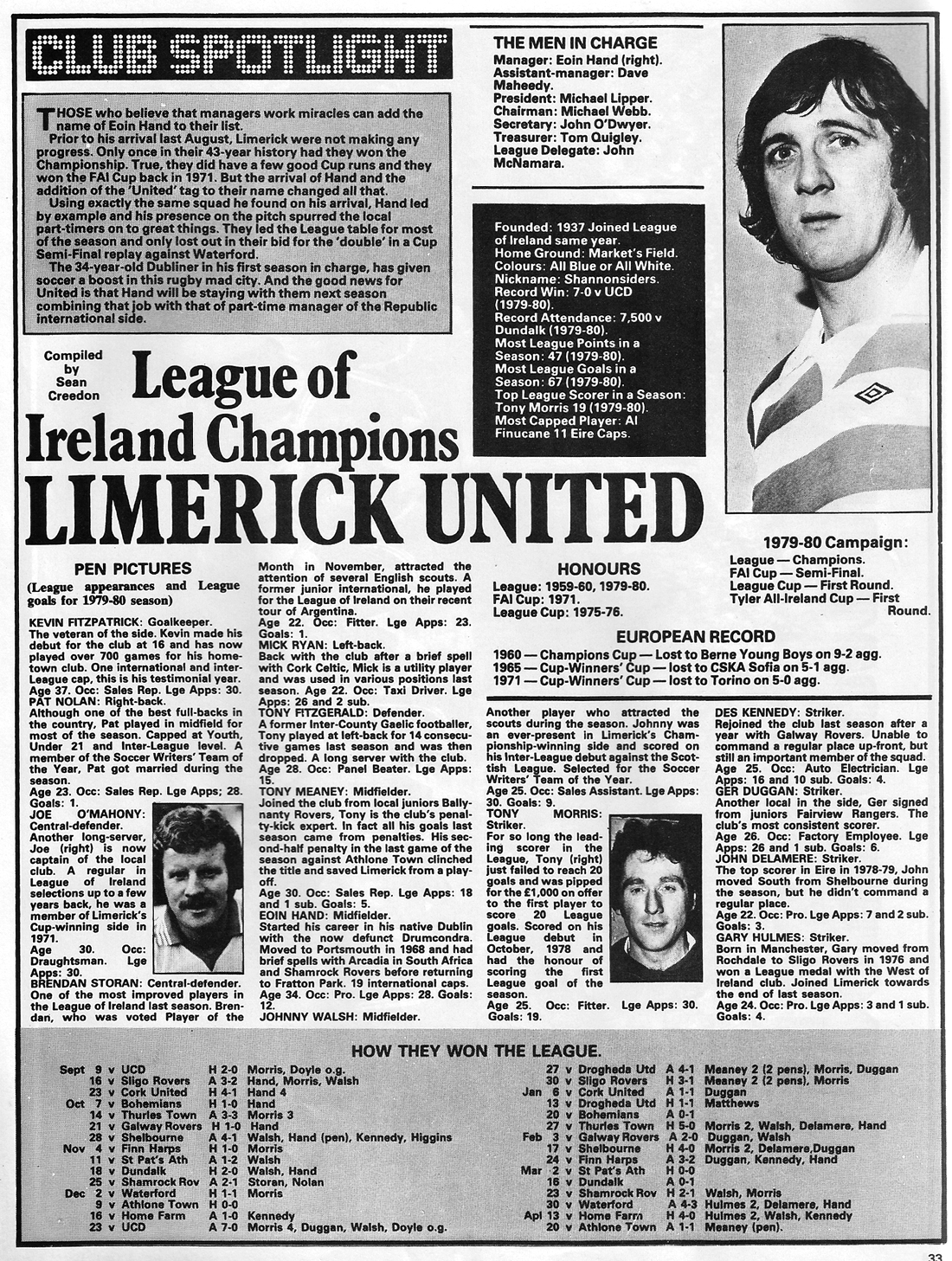 Very sad to hear of the passing of Joe O’Mahony yesterday. Joe was captain of Limerick FC when they won the League of Ireland in 1980 and the FAI Cup in 1982. We scanned these pictures from a 1980 Shoot magazine feature. Joe is third from the left in the front row. That is Eoin Hand behind him and the mascot in front is comedian Karl Spain!