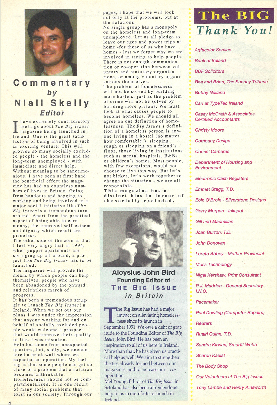 Just stumbled upon this by chance and was a nice trip down memory lane. Was great to see a picture of my uncle Niall looking happy and healthy and full of hope, and to read his commentary in the first issue. Niall Skelly sadly passed away at his home in Wexford in 2015, losing a decade long battle with alcoholism. He ran the Big Issue from 1994-1999 and worked as a social worker for many years after. He was a kind, well intentioned man who ultimately was pulled asunder by being unable to escape traumatic events of his childhood.
