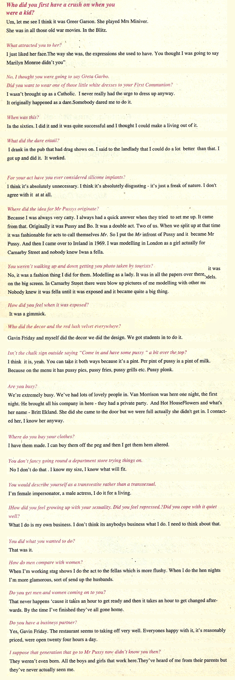 A 1994 Q&A with Mr Pussy (Alan Amsby) scanned from the very first issue of The Big Issues. At the time he and his and business partner, Gavin Friday’s all night restaurant in Suffolk St was in full swing. Check out our previous post on Mr Pussy from 1970 here.